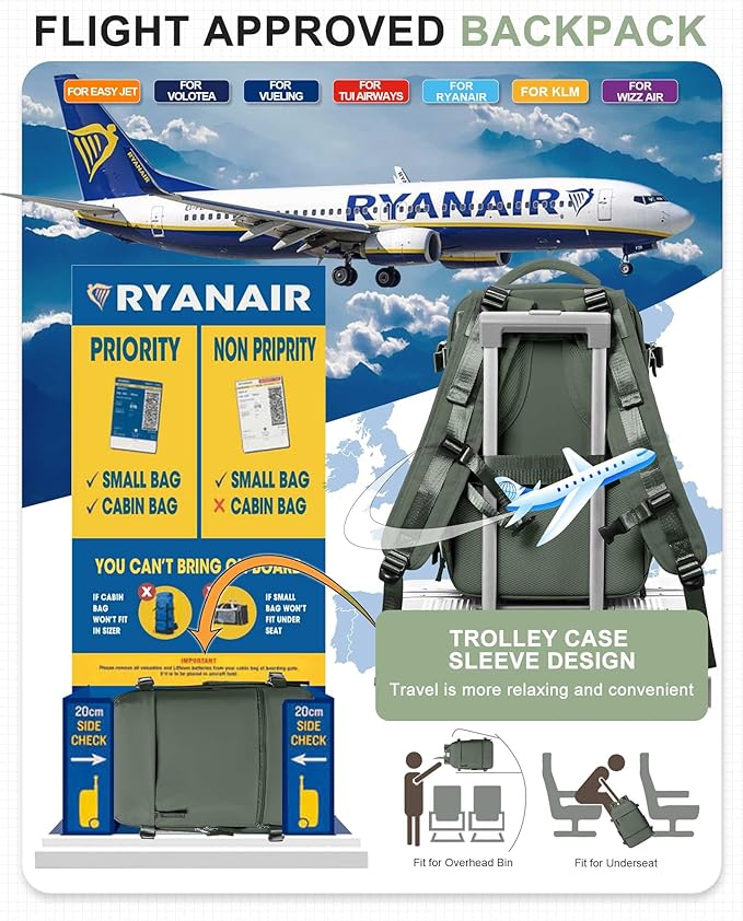 - Flight Approved Travel Backpack: SEAFEW Backpack Size (L*W*H) 25*20*40cm(9.8*7.8*15.7 inch). Carry on Backpack suitable for air travel, easy to place under luggage racks or seats.Integrated trolley sleeve slides over rolling luggage handle making airport travel a breeze. Your ideal overnight weekend boarding bag for business or personal travel.