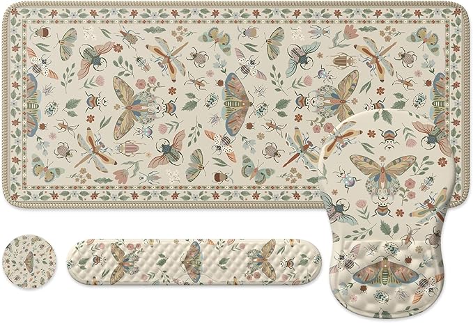 iLeadon Desk Pad Mat,Keyboard Wrist Rest and Mouse Pad Set,Full Desk Mouse Pad Extra Large for Computer Keyboard,Massage Mousepad+Cup Coaster with Non-Slip Base for Home Office,Beige Insect