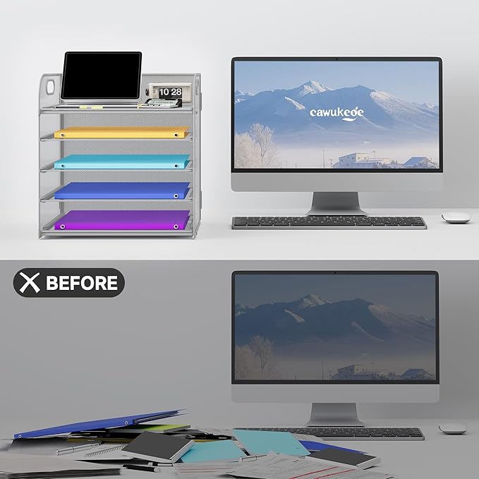 - 【EFFICIENT DESK ORGANIZER】Keep your desk tidy and clutter-free with our 5-Tier Paper Organizer with Handle. This file organizer provides ample space for sorting and storing papers, letters, documents, folders, books, magzines, staplers, caculators and sticky notes.