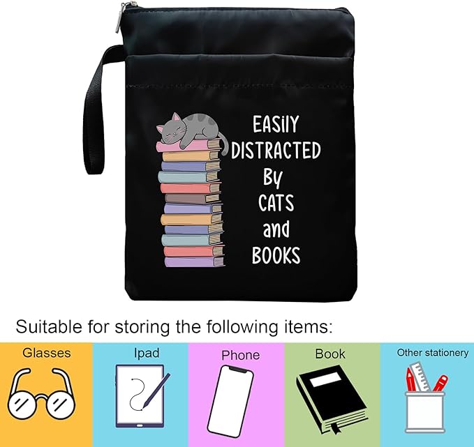 Book Sleeve, Book Covers with Zipper, Funny Cat & Book for Book Lovers, Gifts for Women Teacher Librarian Bookworm Bookish- Easily Distracted by Cats and Books (Black-D, Large)