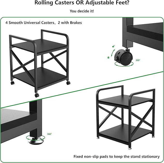 - Both Casters and Foot Pads are Included: The package of the 3D printer table comes with both foot pads and 360°rotate rolling casters so that you can either keep the home printer stands stationary with the feet or mount the casters to move the large printer stand around flexibly. Two of the four wheels are lockable to keep the printer cabinet in position. These foot pads can be fine-tuned to prevent wobbling on uneven ground to keep the printer desk secure