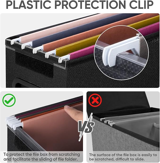 - [UNIVERSAL SIZE] Our file box with lid fits both letter and legal size files. It is designed for efficiency and functionality, with its smooth PVC slide rails on both sides, you can effortlessly slide file folders for easy access and neatly arranged. The lid can fit snugly on the box after hanging folders. (NOTE: file folders are not included)