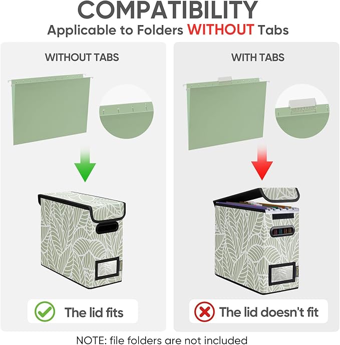 - [UNIVERSAL SIZE] Our file box with lid fits both letter and legal size files. It is designed for efficiency and functionality, with its smooth PVC slide rails on both sides, you can effortlessly slide file folders for easy access and neatly arranged. The lid can fit snugly on the box after hanging folders. (NOTE: file folders are not included)
