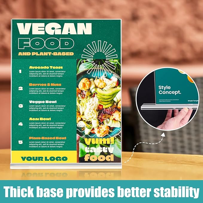 - Double-Sided Acrylic Sign Holder 8.5 x 11 inch - Clear acrylic sign holder allows your flyer to be displayed and protected on both sides, unlike slant back sign holder, which only allows you to display on one side.