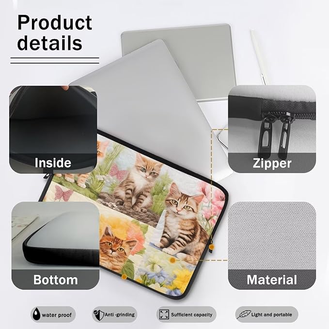 Cat Floral Printed Computer Case Bag for Girls Boys, Washable 15 Inch Laptop Bag Carrying Case Cute Laptop Briefcase Neoprene with Zipper, Compatible with Various Computers