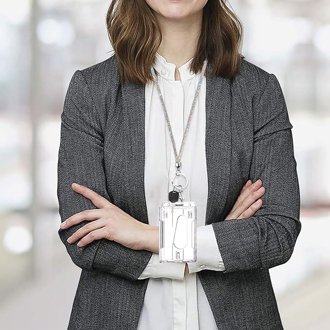 - Crystal Lanyard with Badge Holder. Our id lanyard is made of high-quality crystal beads, with 1 retractable badge reel clip and 1 clear id card holder can hold your keys & id card well, really sparkling and stylish.