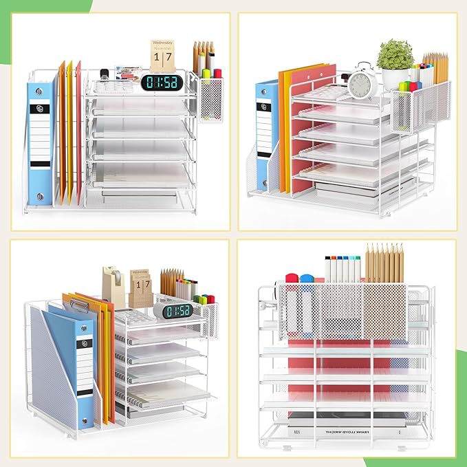 - Multi-functional Desk Organization: With 6-tier Paper Letter trays, 2 vertical file organizer holders, and 1 pen holder, our desk document organizer is more than just storage – it's a complete organizational solution. Easily identify and access your office essentials, enhancing your workflow and productivity.The thoughtful pull-out tray design adds convenience to your daily tasks, making your workspace both efficient and visually appealing.