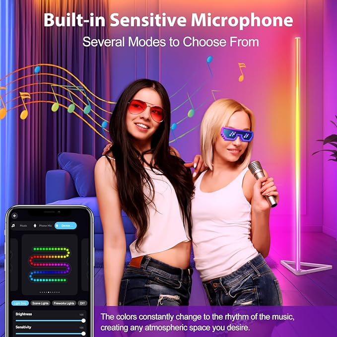 - 【Group control,music synchronization】This floor lamp dimmable can control multiple corner lights separately to achieve different light outputs. You can also link multiple LED standing lamps and control them via the APP to perform light shows at the same time. Features a highly sensitive microphone that detects music and ambient sounds and synchronizes lights with music and movies. An immersive audio-visual experience creates a romantic and cheerful atmosphere.