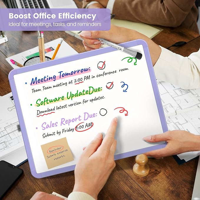 - Double-Sided Design, Double the Space: Unlike other small whiteboards, our double-sided whiteboard offers twice the writing area, making it ideal for organizing schedules, jotting down ideas, and managing multiple projects. It's the perfect family organizer and office whiteboard, enhancing productivity and creativity.