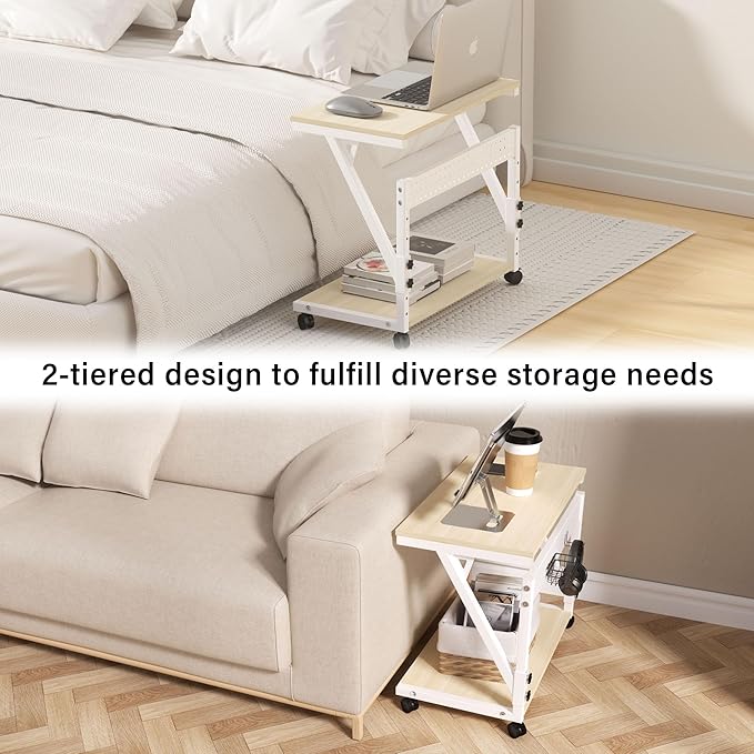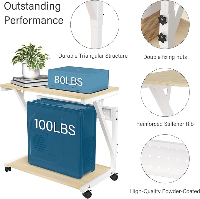 Computer Tower Cart - Height Adjustable PC Stand, 2-Tier ATX-Case CPU Holder Home Office Gaming Desk Accessories with Rolling Lockable Wheels, Laptop Table Standing Computer Desk, Natural White