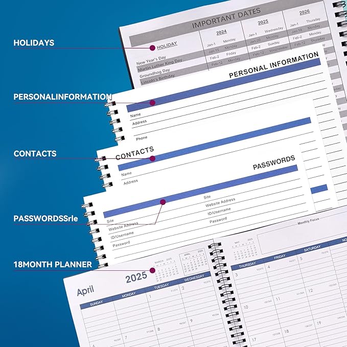 - 2025 Calendar Planner - 7.6 " x 10.2" large planner covers 18 months from January 2025 to June 2026, Also features with important contact page, password page, personal information page and notes page.