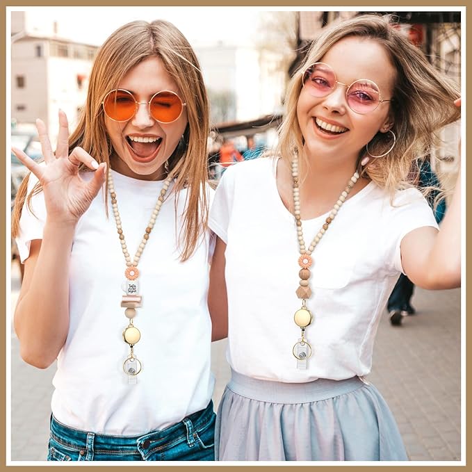Teacher Lanyard with Id Holder, Cute Lanyards for Id Badges Keys, Retractable Natural Wooden Beaded Lanyard for Women