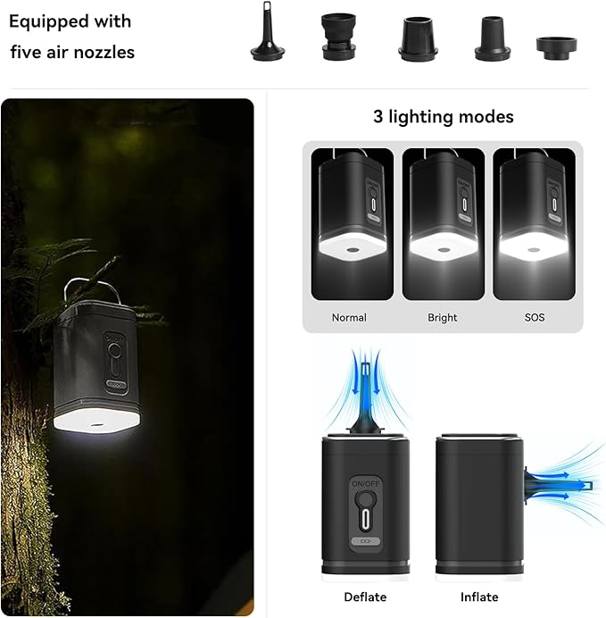 - 【Portable Air Pump with Magic】The multifunctional air pump can not only deflate and inflate (like swimming ring), but can also be used as a hanging camping light with 3 light modes (weak light, strong light, SOS flashing mode).