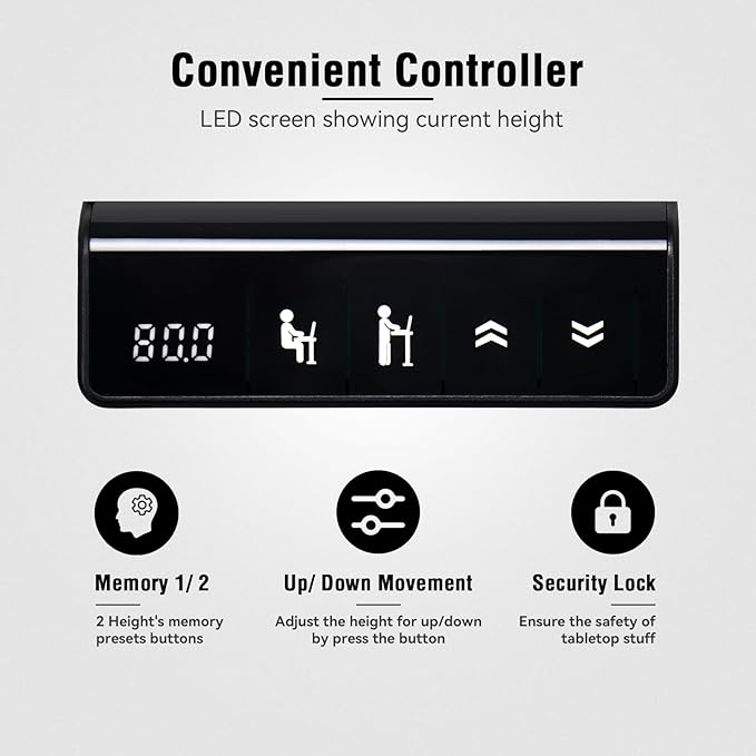 - Smart and User-Friendly Design: The height adjustable table legs feature an intuitive control panel for quick height adjustment with 2 memory presets to save your favorite height settings. The electric standing desk frame operates at a quiet 45 dB to ensure a peaceful environment without distraction.