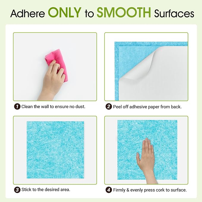 - Strong Self Adhesive Backing: 12"x12" small cork tile easy mounting to create custom bulletin boards, adhesive works perfectly on flat, textureless, dust-free, dry surfaces, a perfect solution to pin your notes and messages in any commercial environment