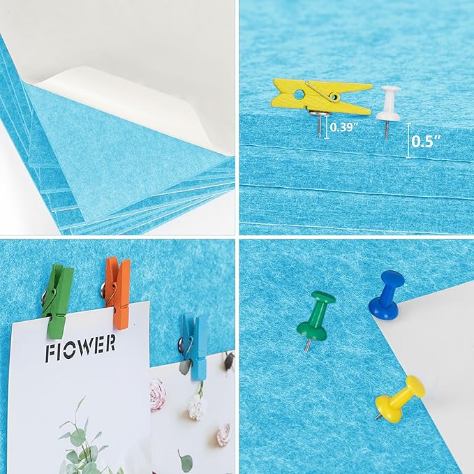 AKTOP Cork Bulletin Board 12x12, 1/2" Thick Felt Cork Board Tiles 6 Pack, Small Square Pin Board for Wall, Self Adhesive Corkboards with 60 Push Pin Wood Clips for School, Home & Office, Baby Blue