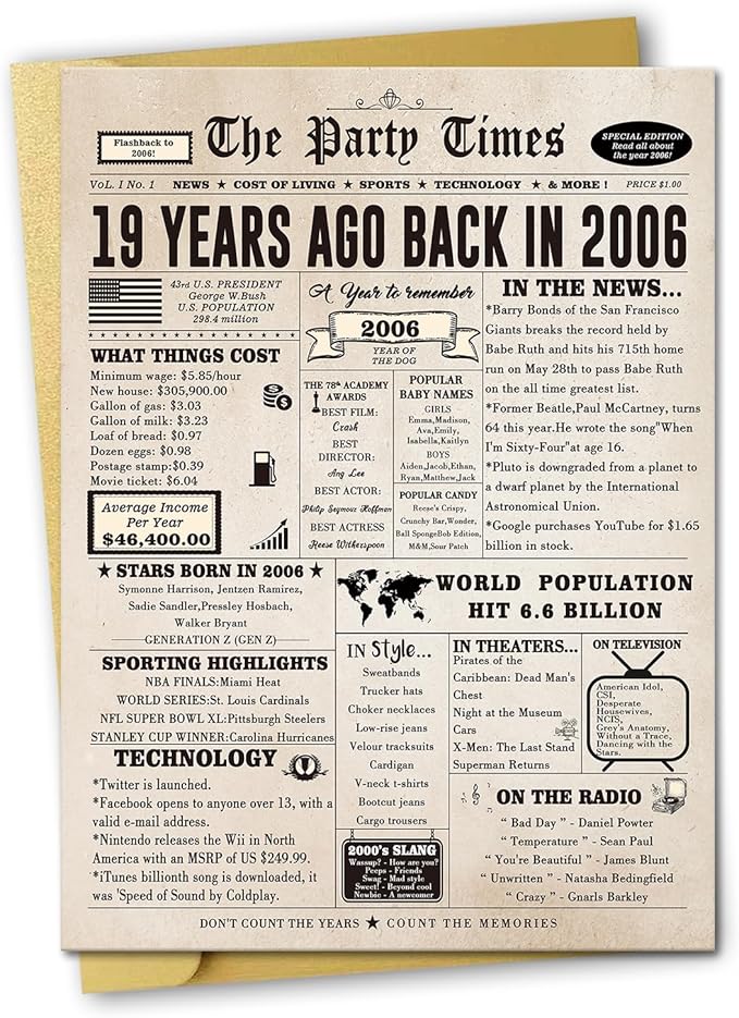 - This large 19th birthday card features a vintage newspaper design, showcasing important events, movies and sports events from 19 years ago.