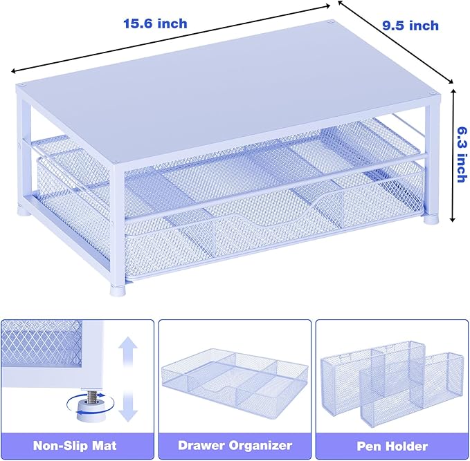 - Save Space:This 2-Tier monitor stand with drawer and 2 hanging pen holders provides ample storage space to keep your office supplies and office desk accessories neatly organized and easily accessible, keeping your workspace tidy and improving your sense of well-being