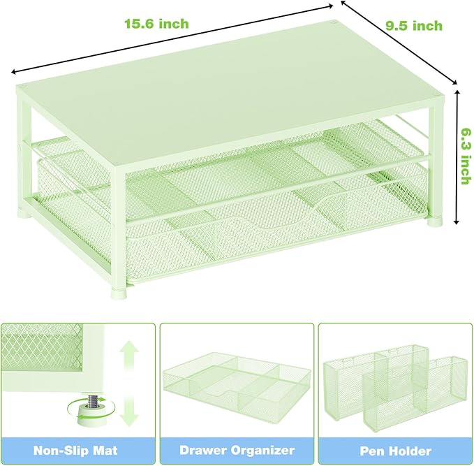 Desk Organizers and Accessories, 2-Tier Computer Monitor Stand for Desk Organizer with Drawer and 2 Pen Holders, Office Desk Accessories Workspace Desktop Organizers for Office Supplies, Green
