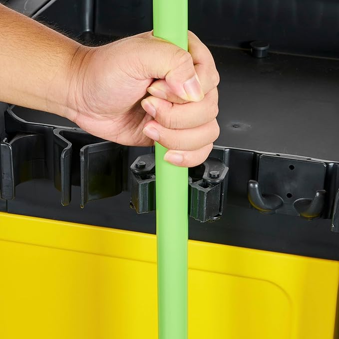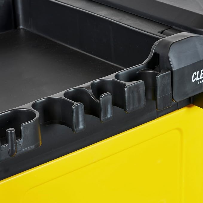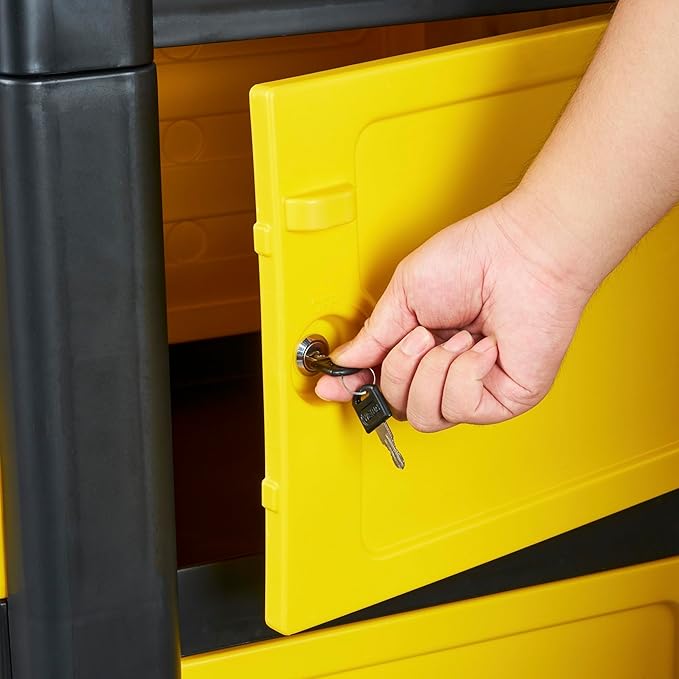- LOCKING CABINET DOORS: Storage made simple and efficient! This heavy-duty janitor cart is equipped with double locking cabinet doors to keep cleaning supplies secure during transport.