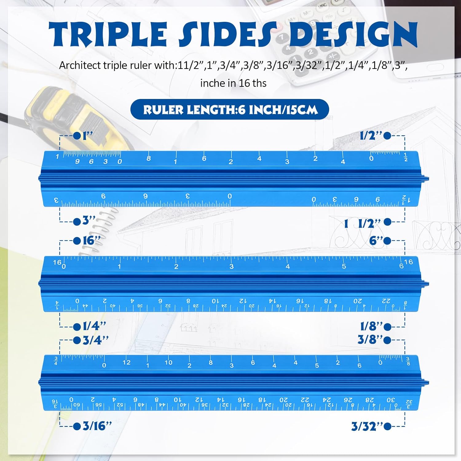 - Versatile Imperial Scale Options: features a range of imperial measurements, including 1-1/2, 1, 3/4, 3/8, 3/16, 3/32, 1/2, 1/4, 1/8, and 3, making this architectural ruler a practical tool for architects, engineers, and artists requiring accurate measurements