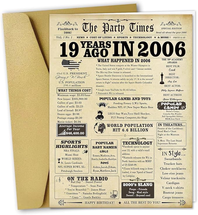 - This lovely 19th birthday card in creative vintage design, This birthday card is filled with some interesting stories about your born year, which can helps you recall the past with family or friend, prepare a commemoration significance gift for your recipient.