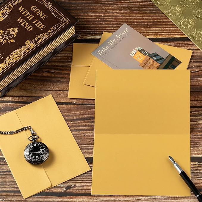 - Versatile Pack: Get 50 shiny self-adhesive envelopes and matching 5x7 inch fold cards with gold stickers for invitations, greeting cards, and mailing.