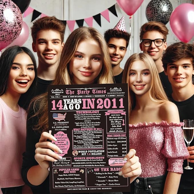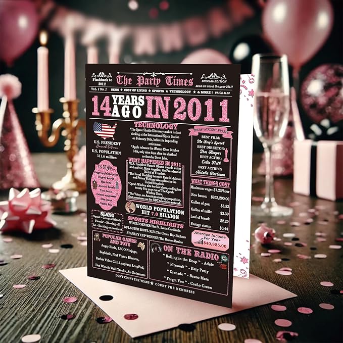 14th Birthday Card Gifts for Girls, Daughter, Niece, Granddaughter, 14th Birthday Decorations for Girls, Large Birthday Card for 14 Year Old, Funny Back in 2011 Birthday Card, Rose Pink Gold