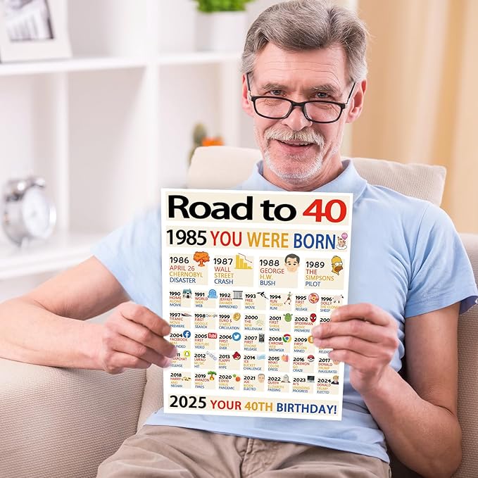 - Memorable Gift: Road to 1985 birthday card contains interesting events that happened every year, would be a memorable gift for anyone who turns 40 in 2025.