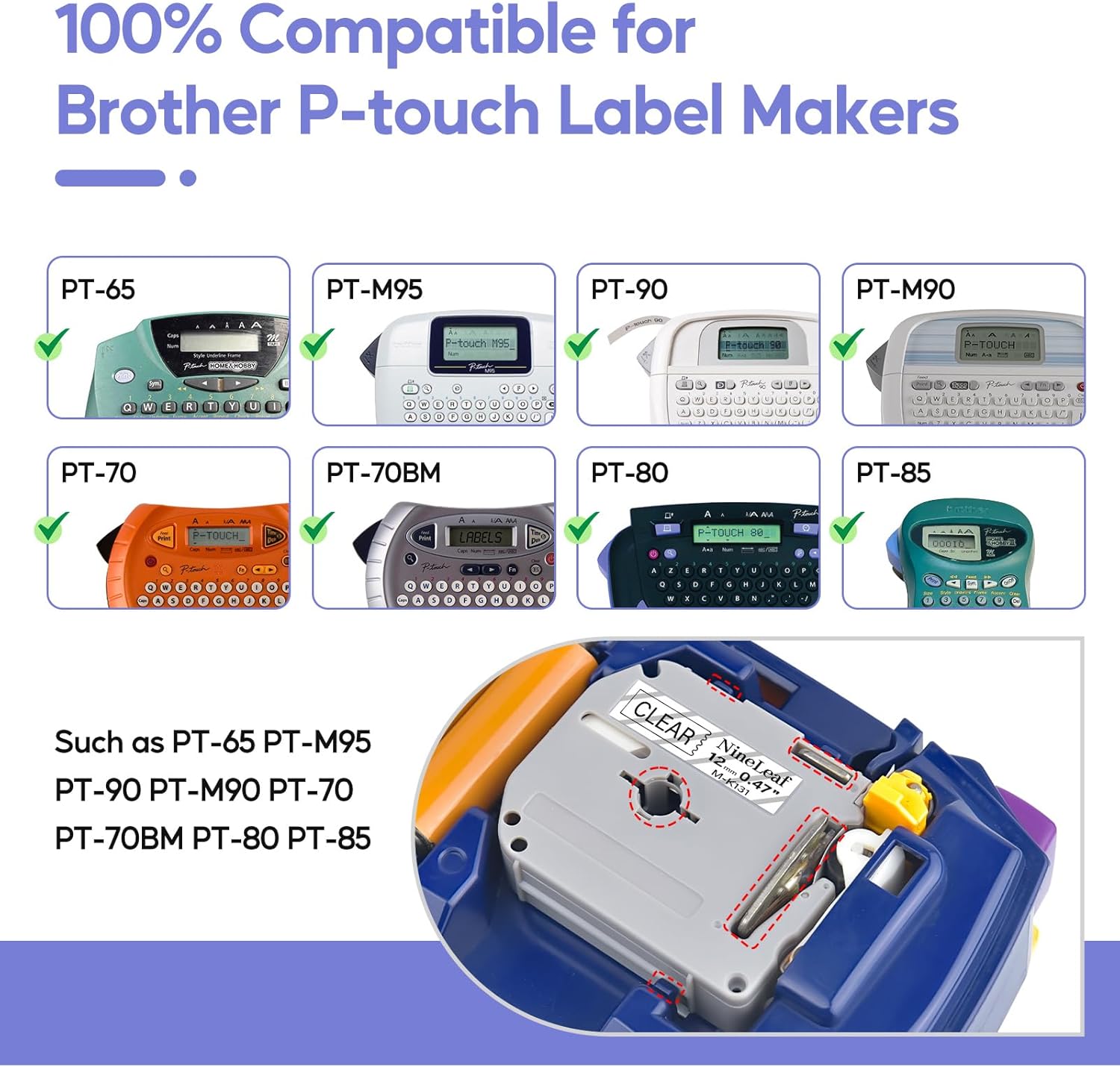 - Compatible for brother p-touch label makers PT-M95 PT-M90 PT-70BM PT-M65 PT-45M PT-55 PT-55S PT-55BM PT-65SB PT-65SCCP PT-65SL PT-65VP PT-70BBVP PT-70BM PT-70BMH PT-70HK PT-70HOL PT-70HOT PT-70SP PT-70SR PT-80SCCP PT-110 and more printers listed in the description.