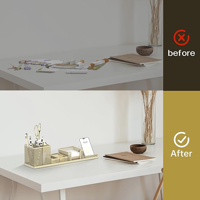 SUPEASY Pen Holder for Desk, 6 Piece Mesh Desk Organizer set, Desk Accessories for Office Organization with Mail Organizer, Letter Phone Holder, Sticky Notes Caddy Storage, Golden Yellow