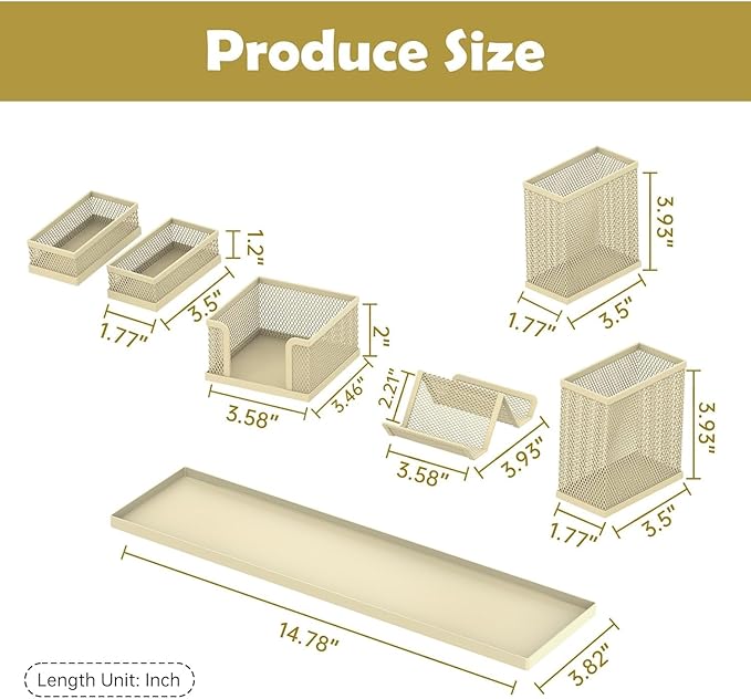 - No Need Assemble: dimensions in inches: 3 compartments Pen Holder: 4.13W x 8D x 4.13H; Round Pen Holder: 3.54D x 3.93H; Paper Clip Cylinder: 3.54D x 1.57H; Sticky Note Box: 3.74W x 3.74D x 2.95H; Business Card Stand: 3.54W x 3.74D x 1.77H; Letter Holder: 2.36W x 3.74D x 1.97H.