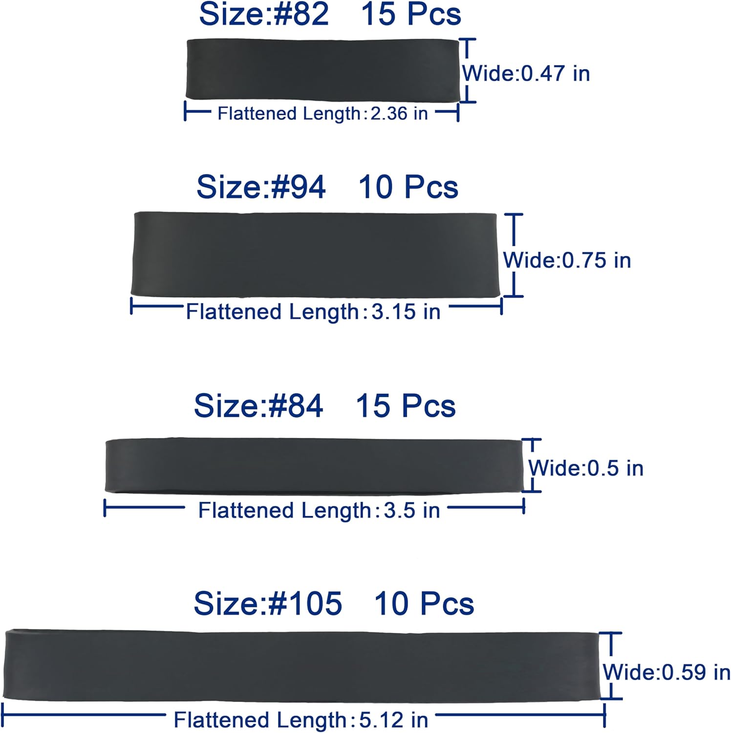 - Size:Assorted Sizes Include size82 (2.5" x 0.5"),size#94 (3.15'' x 0.5''),size#84 (3.5" x 0.5''),size#105 (5.12'' x 0.6'')