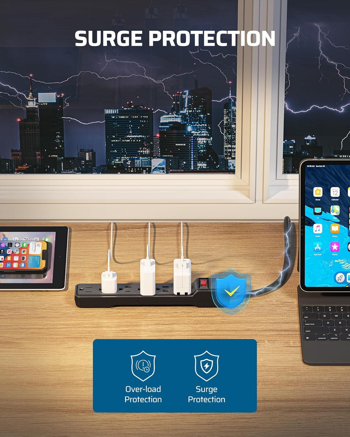 - [Low Profile Flat Plug] With slim flat plug, this surge protector power strip 15 ft cord is designed to fit various usage scenarios, making it ideal for tight spaces behind TV mounts, sofas, nightstands, and headboards, ensures easy placement without obstructing furniture or walls