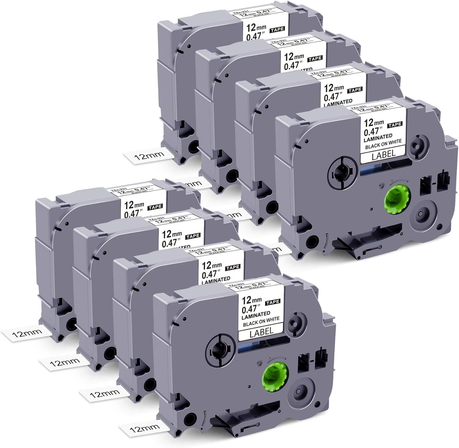 - Package Includes: 8 Pack Compatible with Brother P-Touch label tape TZe-231 TZe231 TZ-231 TZ231 TZC-231 TZe231s; Color: Black on White, Width: (12mm 0.47 inch); Length: 26.2 feet (8 meter) each TZe label tape