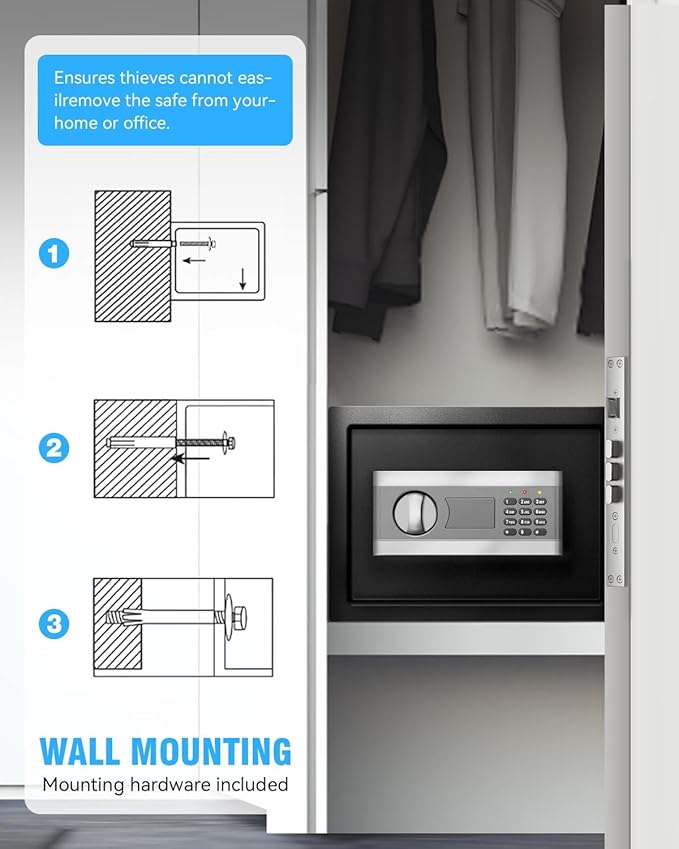 - [Secure Anchoring Design]: Pre-drilled holes and mounting hardware enable secure installation on walls, floors, or inside closets to further protect the safe from theft or unauthorized removal.