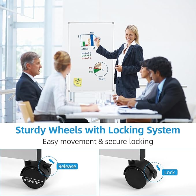 - 【Easily Rolling】Four universal caster wheels make it easy to move our dry erase board around the room or in any position you desire. And each wheel has a locking system to hold the board in place if necessary, providing stability as you write and erase
