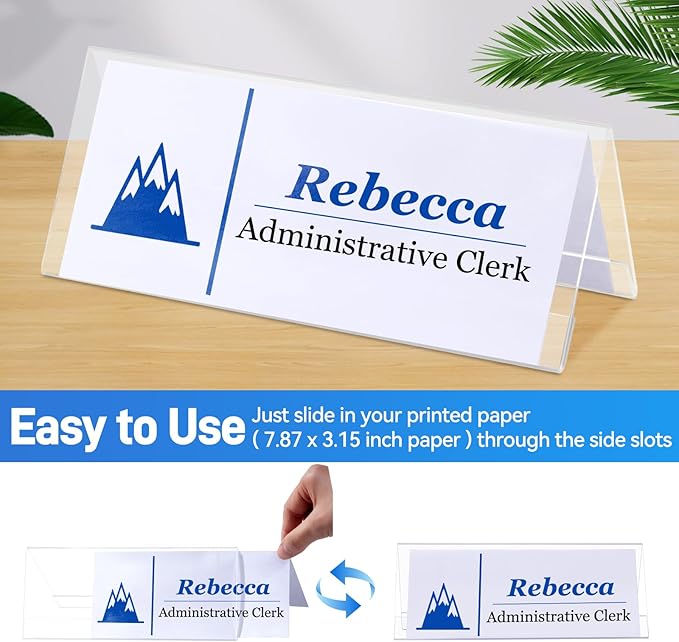 - Handy & Easy to Use: Each nameplate measures 3.15" x 7.87", and the v-shape ensures maximum visibility and adds a sleek touch to your space. Just slide in your printed paper ( 3.15x7.87 inch paper ) through the side slots for a quick and easy installation or change of names. Our blank name plates are reusable, providing great value