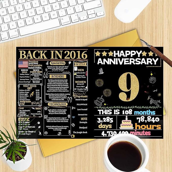Joycard 9th Anniversary Card for Women Men, Gold Wedding Card for Wife Husband, Sweet Marriage Decorations Gifts for Couple, Perfect for Her Him on Anniversary Day, Back in 2016