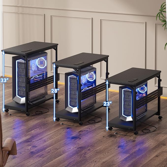 - Manual Adjustable Heights - Features 3 heights to suit your desk heights. From 23" to 28" and 28" to 33", you can fix the height by turning the knob easily. Then you can place this PC tower stand under your desk for space saving & can be pulled out to add extra workspace.