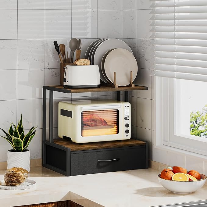 Printer Stand with Storage for Desk, with Fabric Drawer Desktop Printer Stand Shelf Organzier for Home Office, for Above and Under Desk Printer Table, Fax Machine Copier Scanner, Rustic Brown