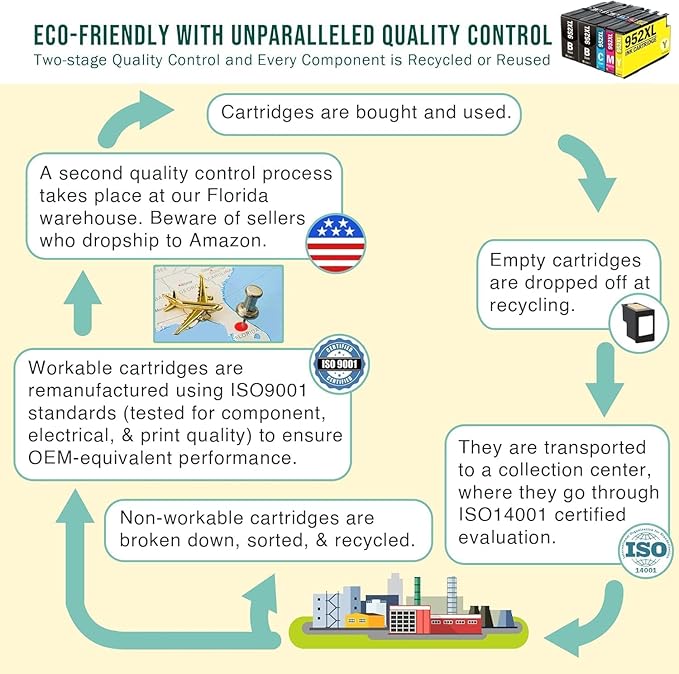 - GET RELIABLE, QUALITY PRINTS – AS GOOD AS ORIGINAL INK. Get your ink from a US-based, accountable company that can be reached easily. Our remanufactured ink cartridges are tested to ensure consistent, quality prints that match the image/text seen on one's printer both at the component level and with print tests. All cartridges are tested both at manufacturing, and again at our FL warehouse. This is done to ensure our ink perfectly matches your printing needs- with vivid colors and sharp text.