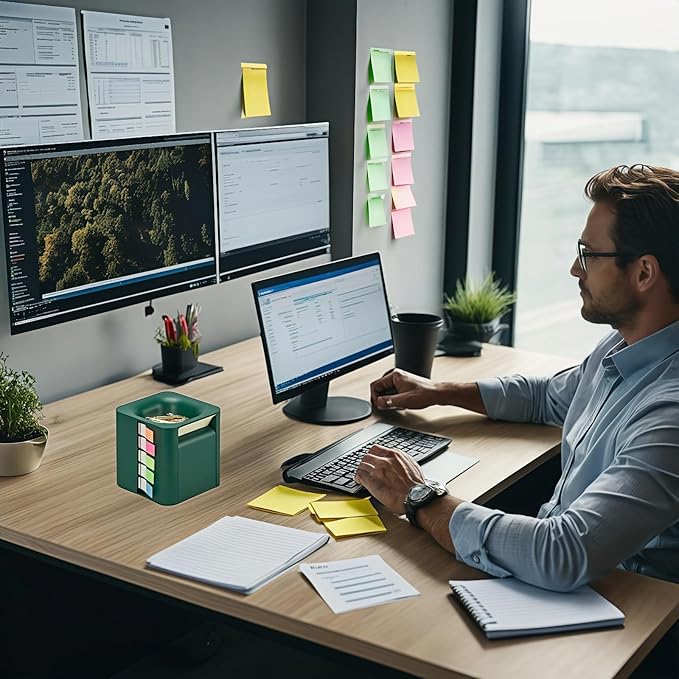 5-in-1 Sticky Note Holder for Desk - Pop Up Sticky Note Dispenser with Pop Up Post Its, Sticky Note Holder & Storage, Magnetic Absorber Case for On-The-Go Organization (Dark Green)