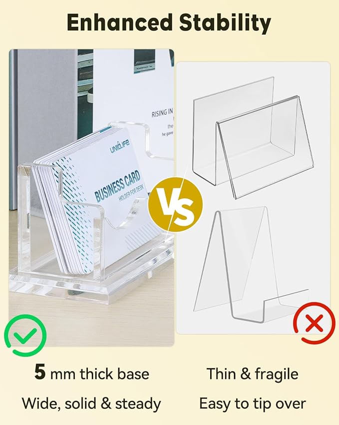- 5 mm Thickened Acrylic: Crafted from reliable acrylic, the business card display stand combines sleek transparency with exceptional sturdiness. Crystal-clear design highlights every detail of the cards, adding a professional touch to any desk