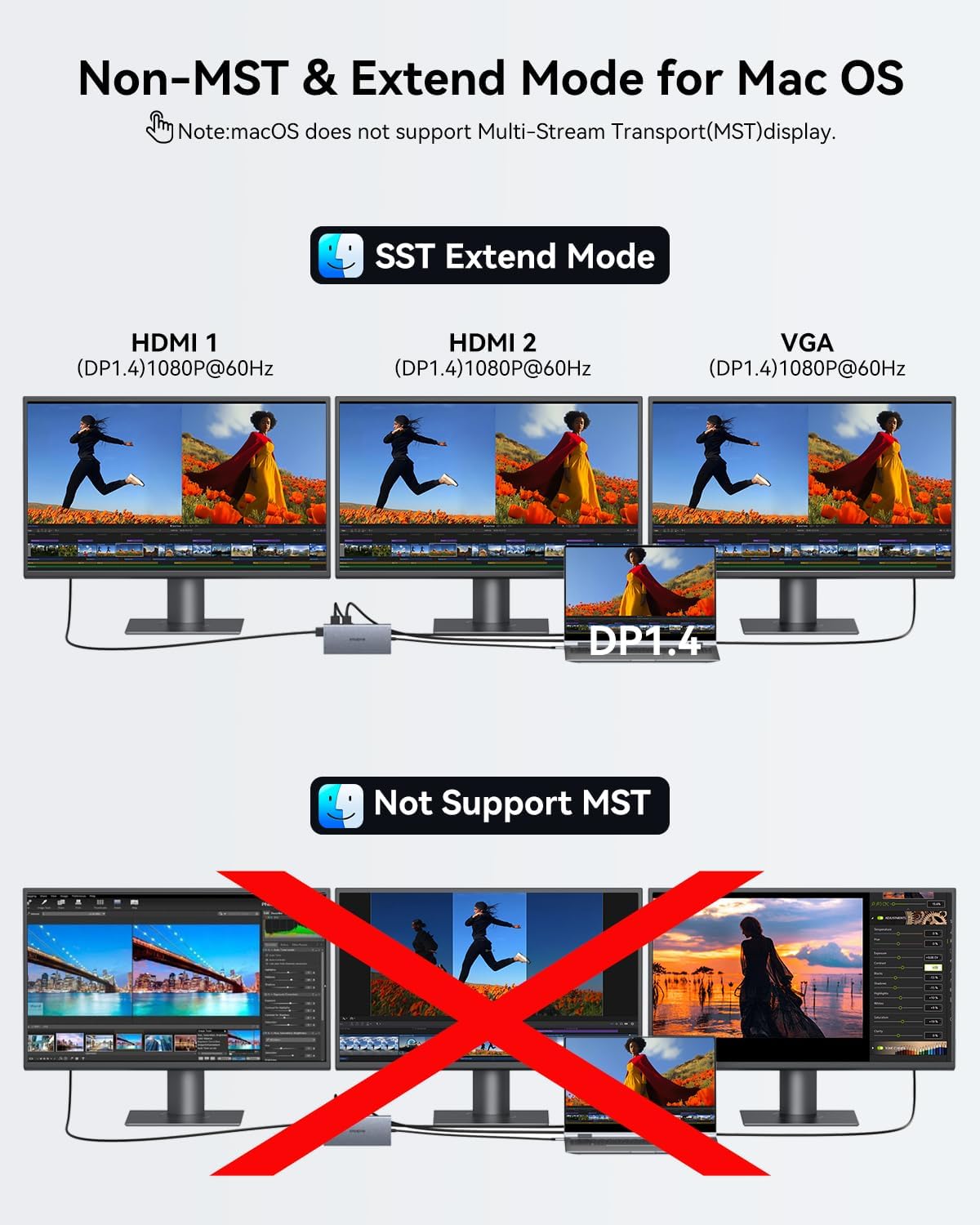 - Triple Display Docking Station for 3 Monitors: Elevate your multitasking game with this hdmi docking station 3 monitors setup, designed to deliver exceptional performance for Windows and Mac users. For Windows systems, it offers both MST and SST modes, allowing you to choose between mirroring or extending your screen. Mac systems support only mirrored display. When using a single HDMI 1 port, enjoy stunning 4K@60Hz resolution, while HDMI 2 delivers up to 4K@30Hz. For dual monitors, achieve 4K@30Hz and 1080P@60Hz (DP1.4), and for triple monitors, experience seamless 1080P resolution (DP1.4)