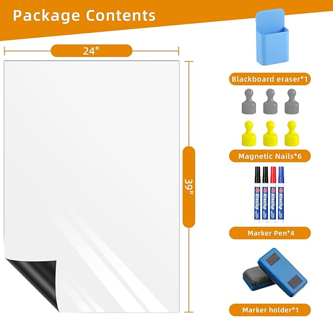 Dry Erase Adhesive Whiteboard Paper, 24" x 39" Stick on Magnetic Contact White Board Sticker on Wall for School, Office, Kitchen Fridge, Kids Drawing
