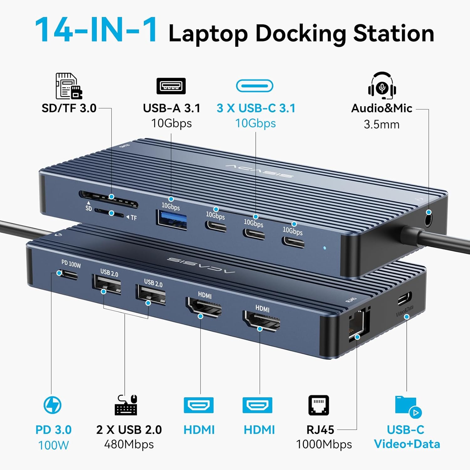 - 【14-IN-1 USB C Video Hub】Plug and play,ACASIS USB C Docking Station Dual Monitor easily expands your laptop from a single USB C/thunderbolt 3/4/type C port to a 14-port mobile workstation, This Docking Station with 2*HDMI + 4 *USB C 3.1-10Gbps + 2*USB 2.0,+SD/TF card reader+1000Mbps Ethernet+3.5mm audio and microphone+ PD 100W charging, as well as a full-featured USB C video port.