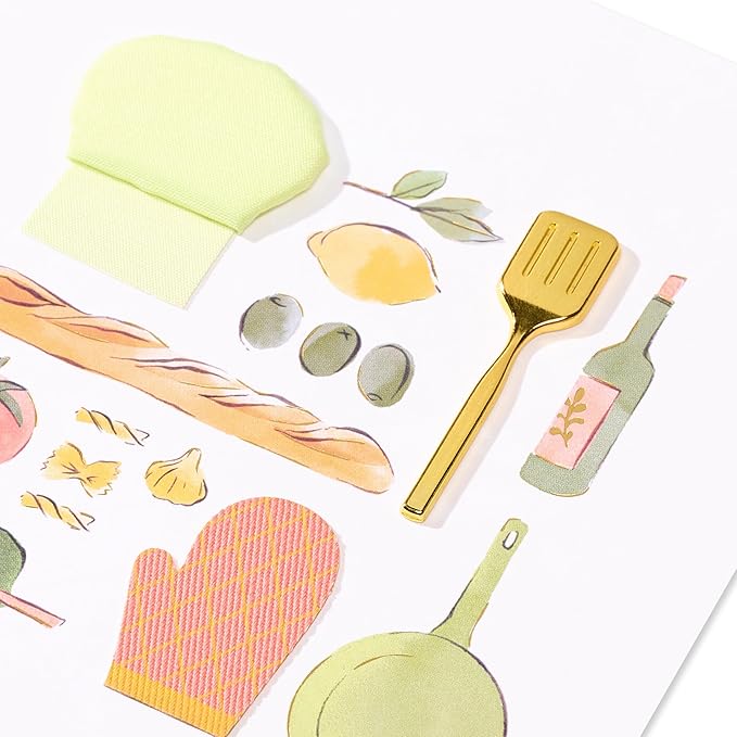 - This handmade Papyrus birthday card features culinary illustrations including a chef's hat, cooking utensils, and fresh ingredients, with gold foil accents, embroidery, and a unique charm