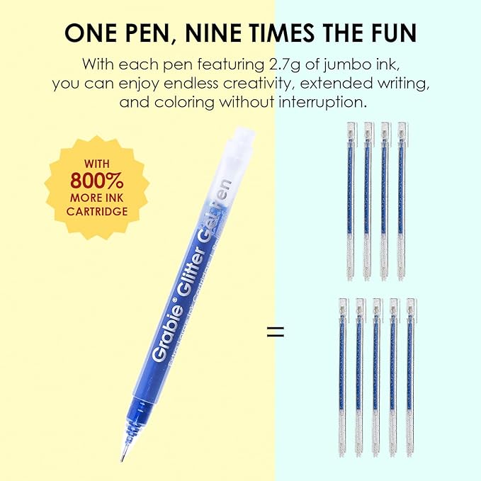 - Unleash your creativity and add a touch of sparkle to your artistic endeavors with the upgraded Grabie Glitter Gel Pens. Now featuring an impressive array of 18 vibrant colors, these pens are enhanced with a staggering 800% more ink capacity, allowing you to create for hours without interruption. One pen is equivalent to an astonishing nine standard iridescent glitter gel pens, ensuring your imagination ignites with every stroke.