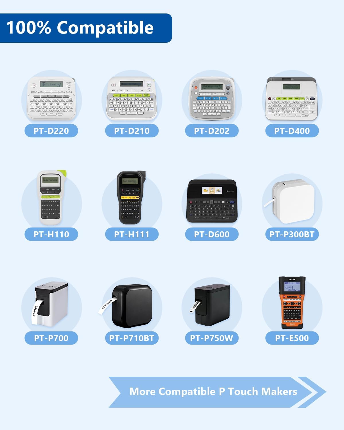 - Compatible with Brother Ptouch Label Maker: PT-D210, PT-D220, PT-H110, PT-D200, PT-H111, PT-D610BT, PT-D460BT, PT-D410, PT-D600, PT-P710BT, PT-P310BT, PT-1290, PT-H100, PT-D400AD, PT-P700, PT-1230PC, PT-1890C, PT-D600VP, PT-P750W, PT-2730VP, PT-D450, PT-D400, PT-1880C, PT-1880, PT-H500LI, PT-2730, PT-1890w, PT-2430PC, PT-9700PC, PT-2300, PT-1280SR, PT-2030AD, PT-1090, PT-1880w, PT-9600, PT-1000, PT-1010 ect